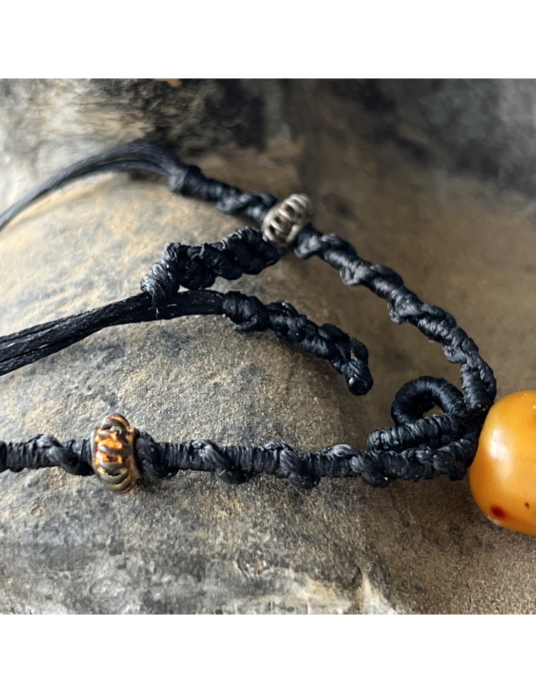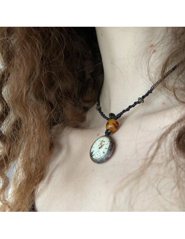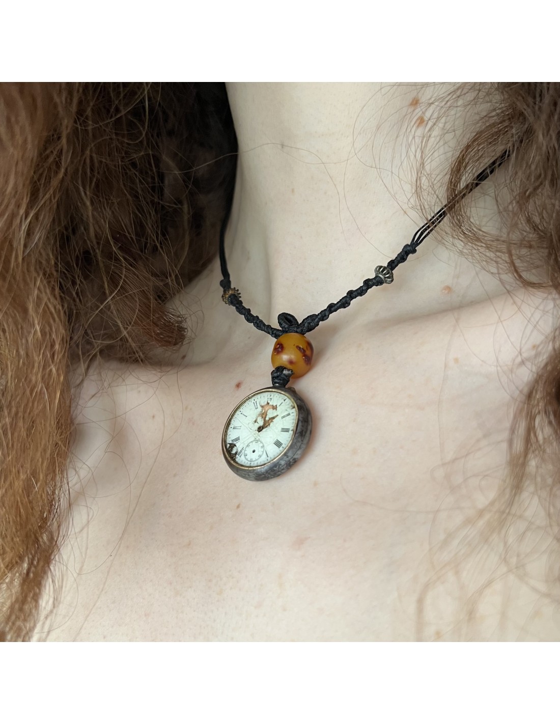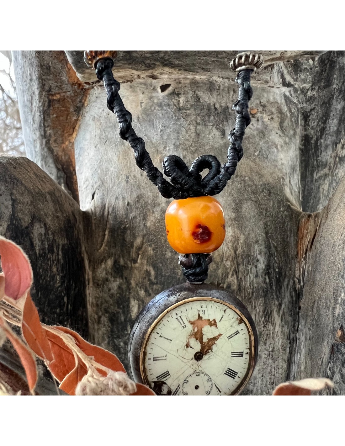 Γυναικείο ρολόι τσέπης από τις αρχές του 20ου αιώνα, μεγάλη vintage χάντρα κεχριμπάρι και μεταλλικές χάντρες απο παραδοσιακά κοσμήματα 19ου αιώνα, δεμένα μεταξύ τους σε αυτό το κολιέ μακραμέ, που ονομάζεται The Time Traveler!