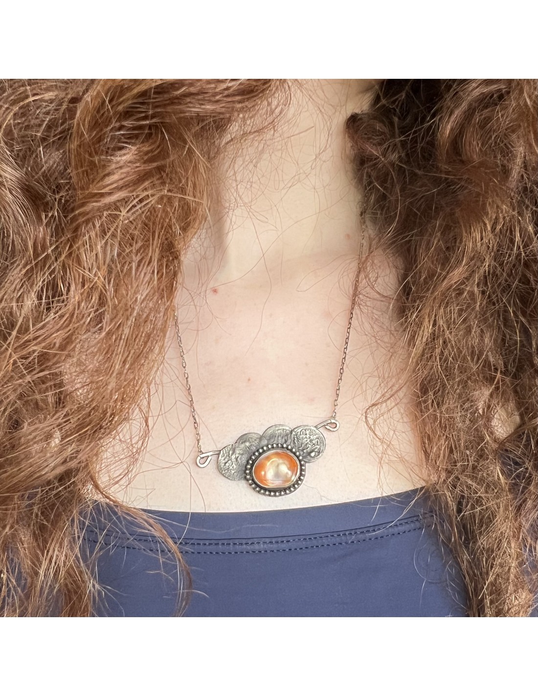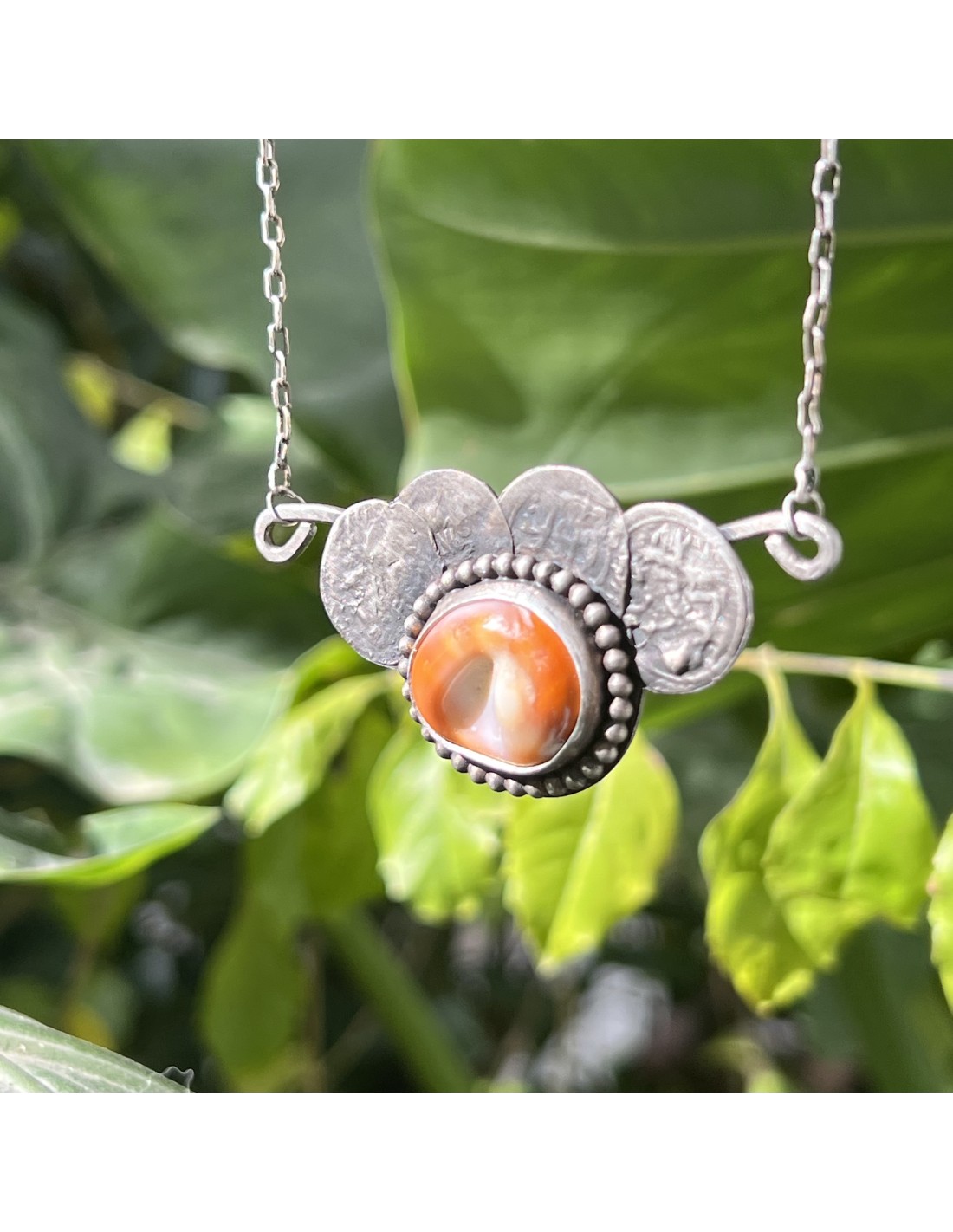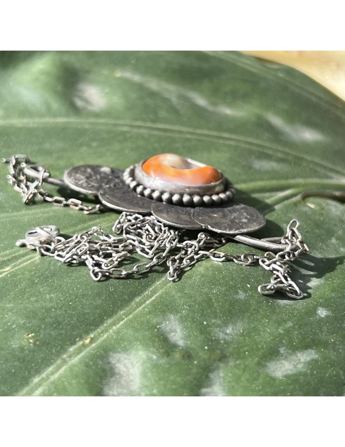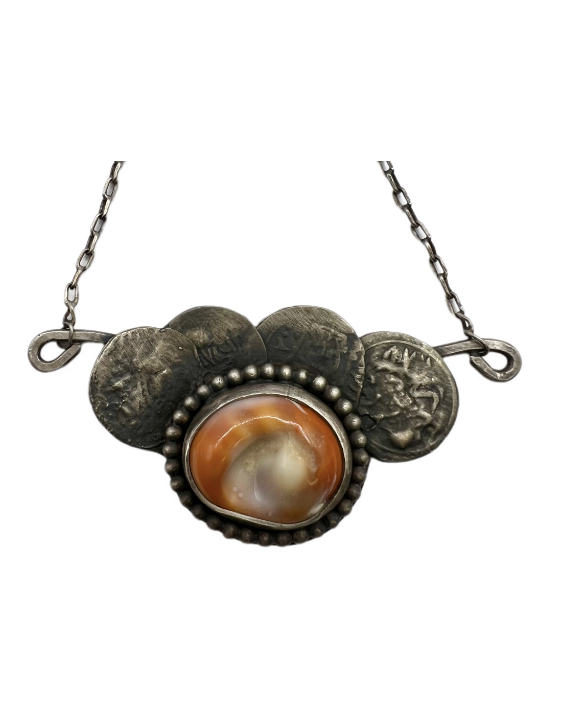 Κομψό ασημένιο κολιέ από ασήμι 925, φυσικό κοχύλι ''μάτι της θάλασσας'' και ασημένια νομίσματα του 19ου αιώνα.