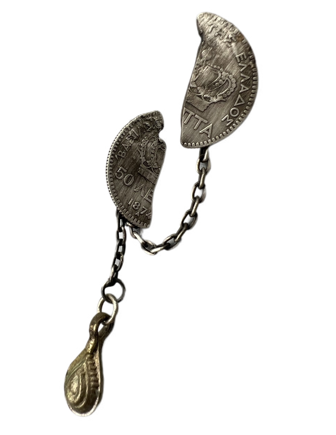 Silver coin turned into a double piercing earring! A silver chain with a hanging 19th century ornament is connecting the two halves of the coin