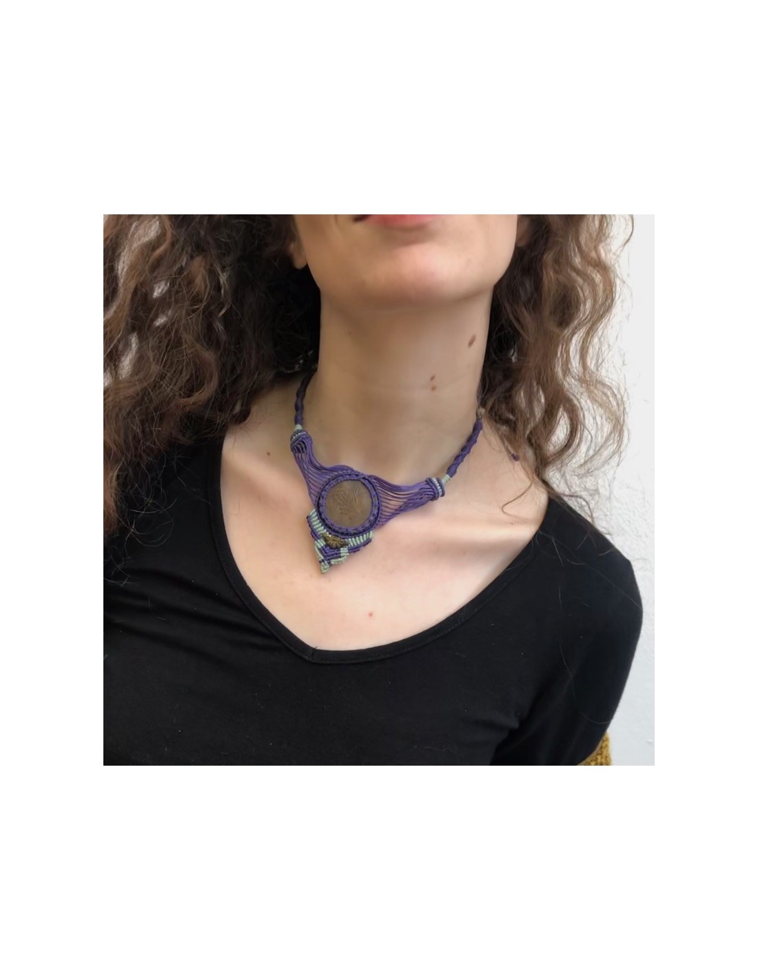 Copper coin from the 1800s of the Ottoman Empire and traditional ornaments bound together in a purple macramé necklace